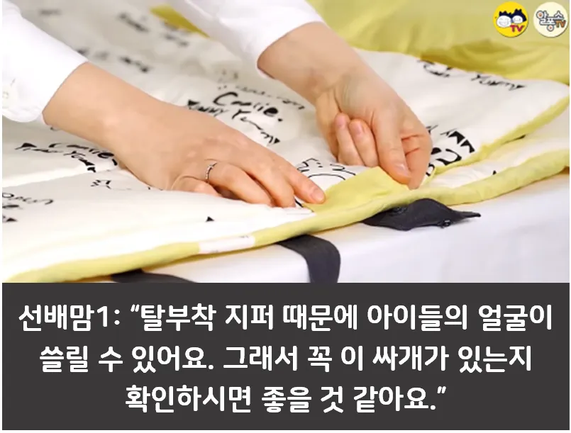 우선 탈부착이 가능한지를 살펴보시고요, 지퍼 부분에는 싸개가 있어서 아이들의 얼굴이 쓸리는 것을 방지
