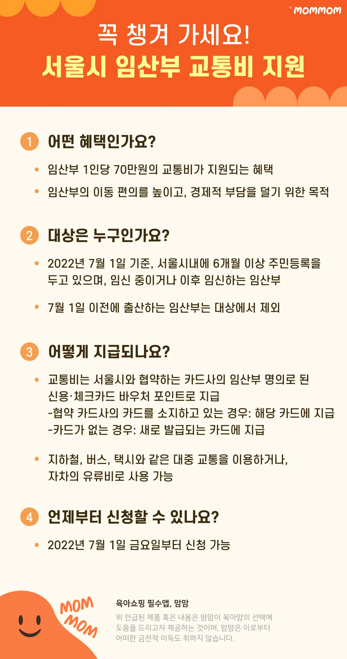 2022년 7월 1일 기준으로 서울시내에 6개월 이상 주민등록을 두고 있으며, 임신 중이거나 이후 임신하는 임산부를 대상으로 해요!