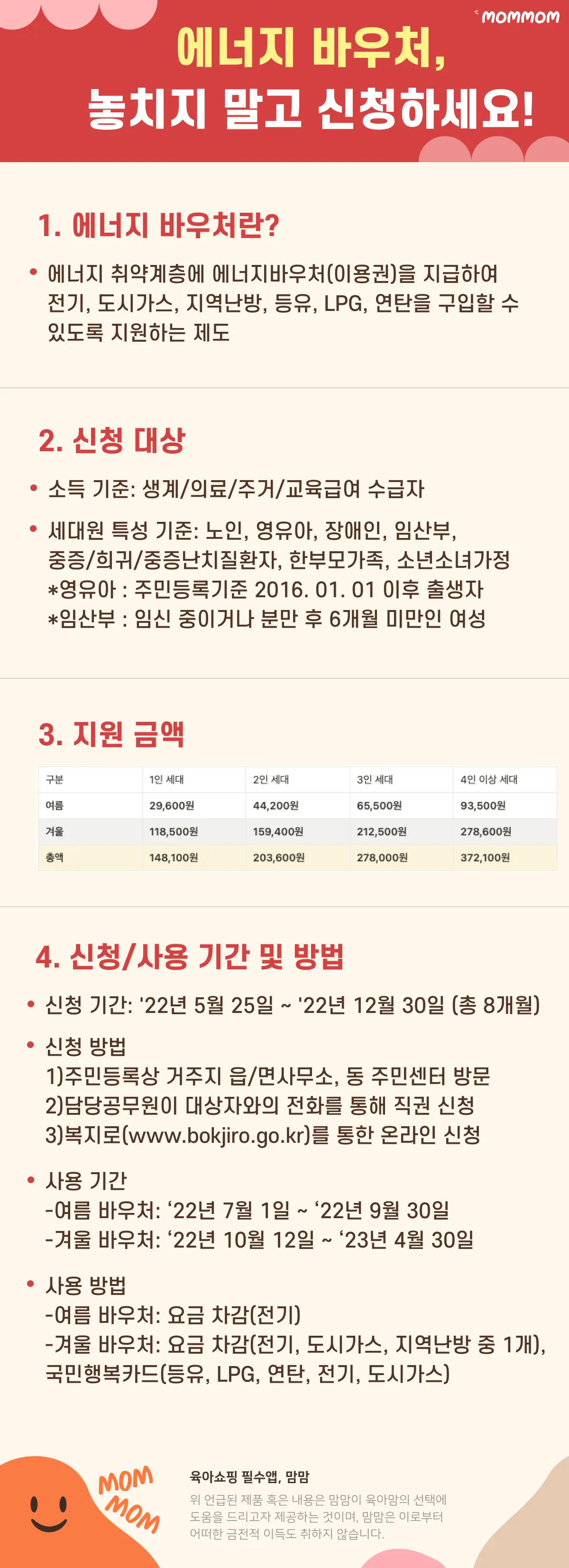 국민 모두가 따뜻한 겨울을 보낼 수 있도록 에너지 취약계층을 위해 에너지바우처(이용권)을 지급하여 전기, 도시가스, 지역난방, 등유, LPG, 연탄을 구입할 수 있도록 지원하는 제도입니다!