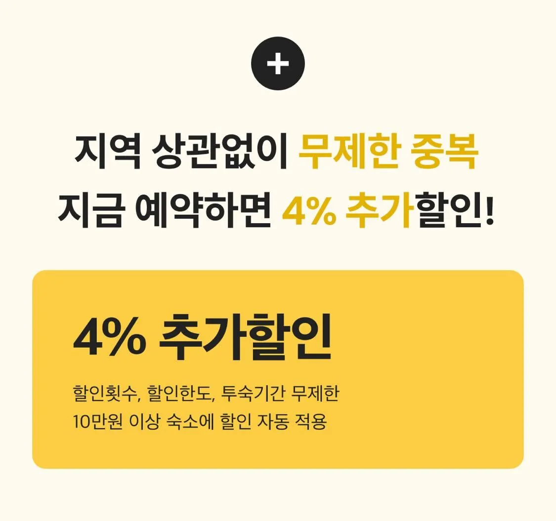 할인 횟수, 한도, 투숙기간 제한이 없고 10만원 이상 이상 숙소에 알아서 자동 적용됩니다!