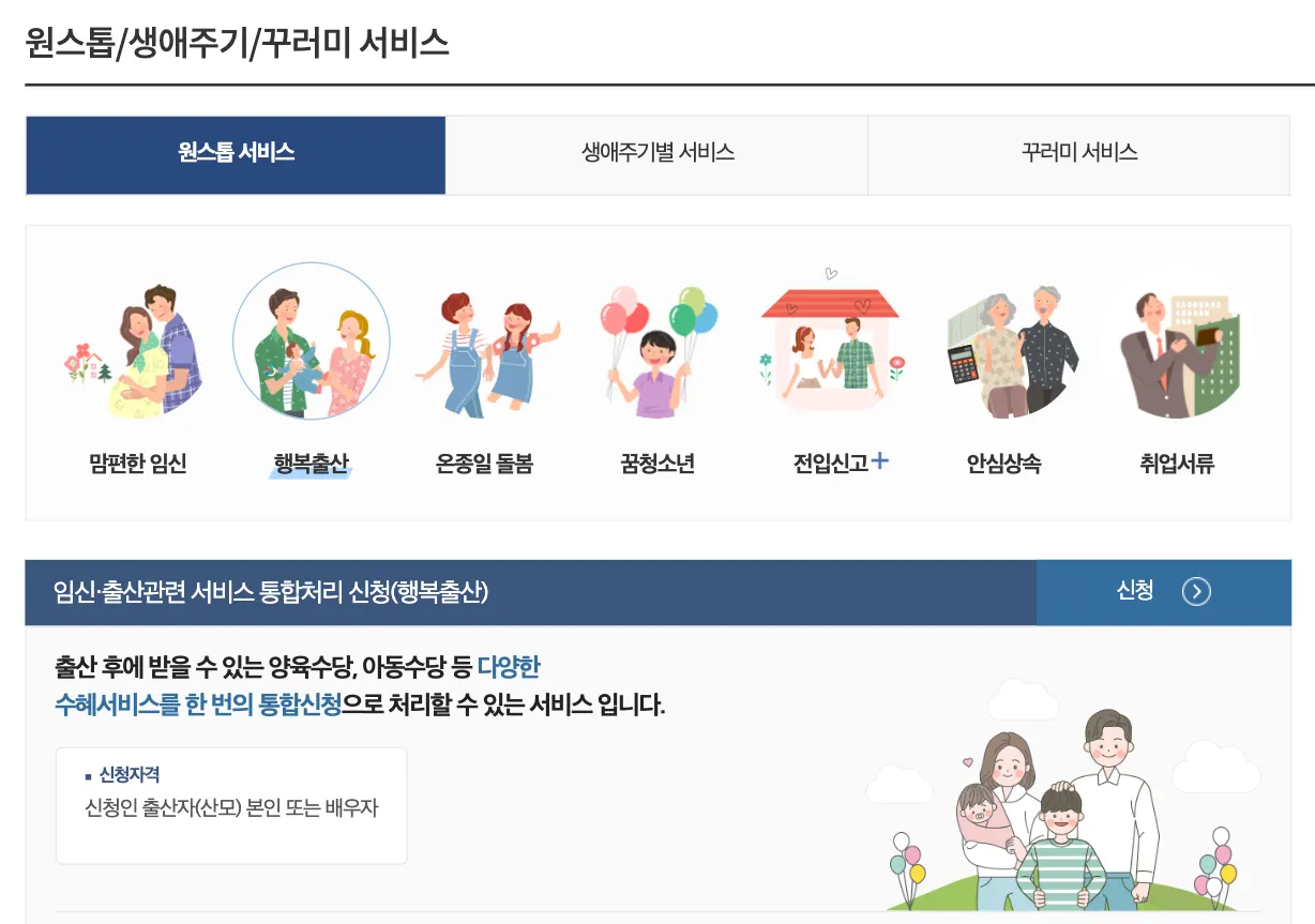 출산 후에 받을 수 있는 양육수당, 아동수당 등 다양한 출산지원 서비스를 한 번에 통합신청하는 서비스랍니다!