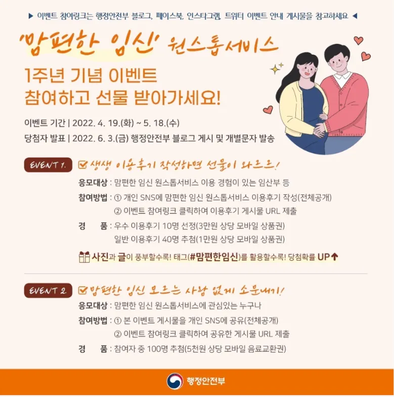 맘편한 임신 원스톱 서비스의 전국 시행 1주년을 맞아 온라인 이벤트가 진행되고 있어요!