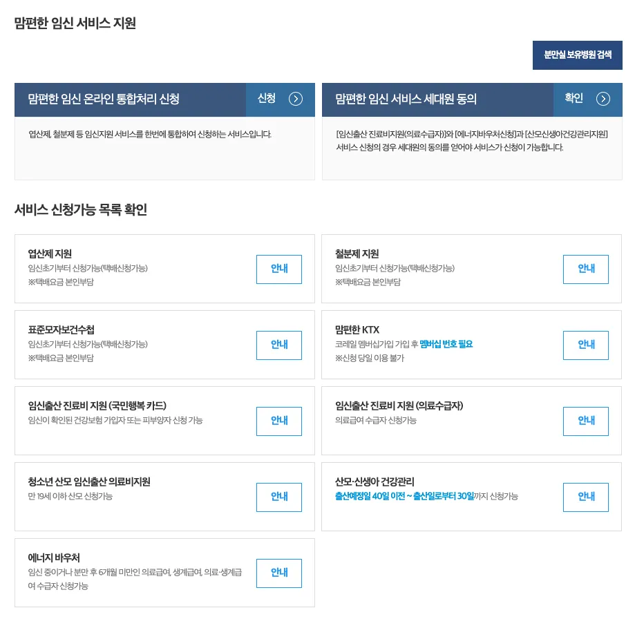 각종 임신 및 출산 지원 서비스를 정부 24나 보건소, 주민센터에서 한번에 안내받고 신청할 수 있는 서비스입니다!