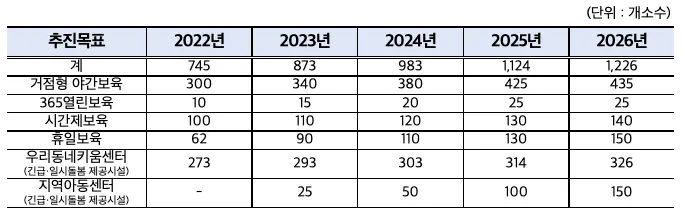 또한, 방과 후 초등돌봄을 책임지는 ‘우리동네키움센터’와 ‘구립 지역아동센터’는 2026년까지 각각 273개소→326개소, 38개소→130개소로 확충한다고 해요.