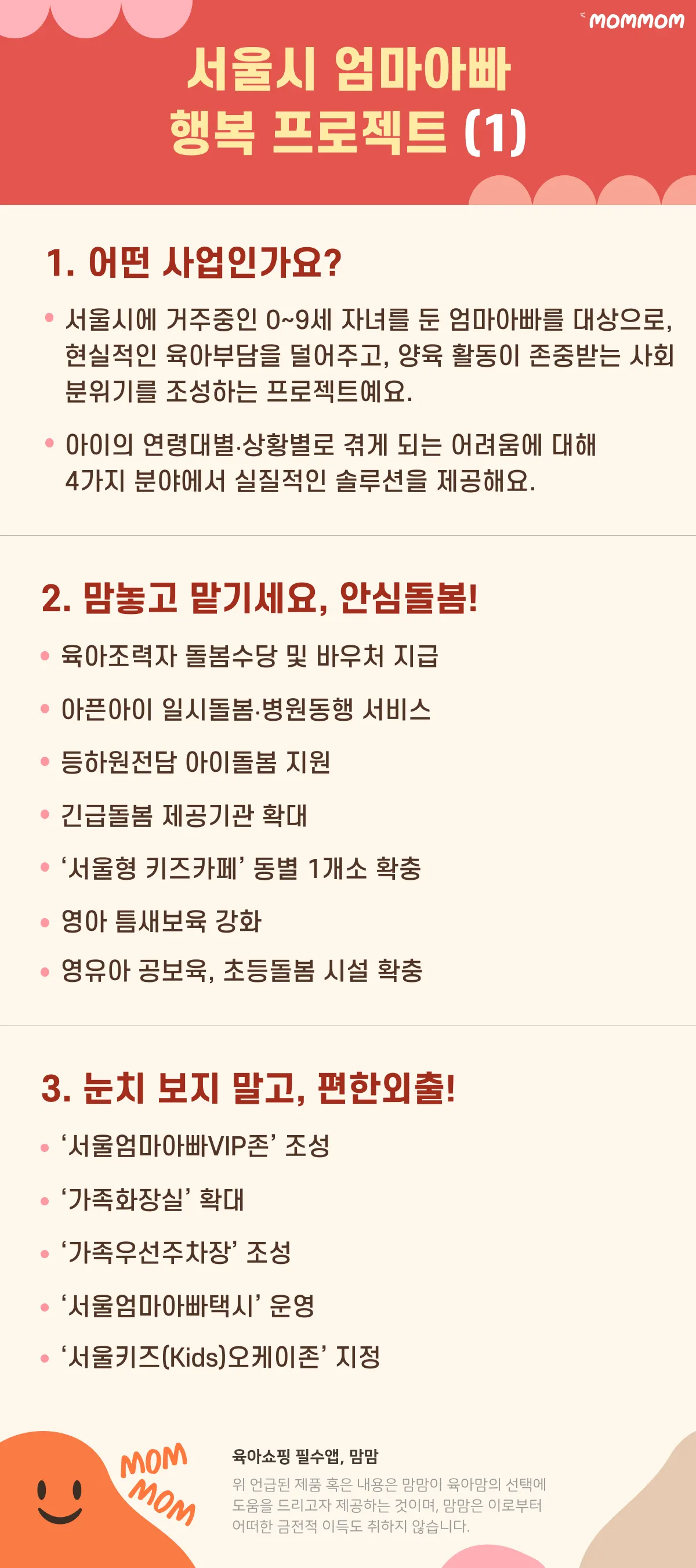 성장 과정에서 가장 손이 많이 가는 시기인 0~9세 자녀를 둔 엄마아빠의 가장 현실적인 육아부담을 덜어주고, 양육 활동이 존중받는 사회 분위기를 조성해 아이 키우기 좋은 서울을 만들기 위한 프로젝트입니다.