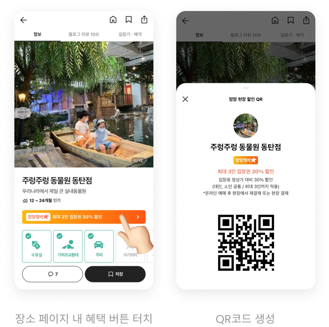 내정보 탭 중간에 [맘맘 멤버십] 메뉴를 클릭한 후, [키즈 핫플 무제한 현장 할인] 을 클릭하면 할인 받을 수 있는 장소 목록이 나와요. 원하는 장소의 [QR 현장 할인 받기] 버튼을 눌러 사장님/직원에게 제시해 주세요.