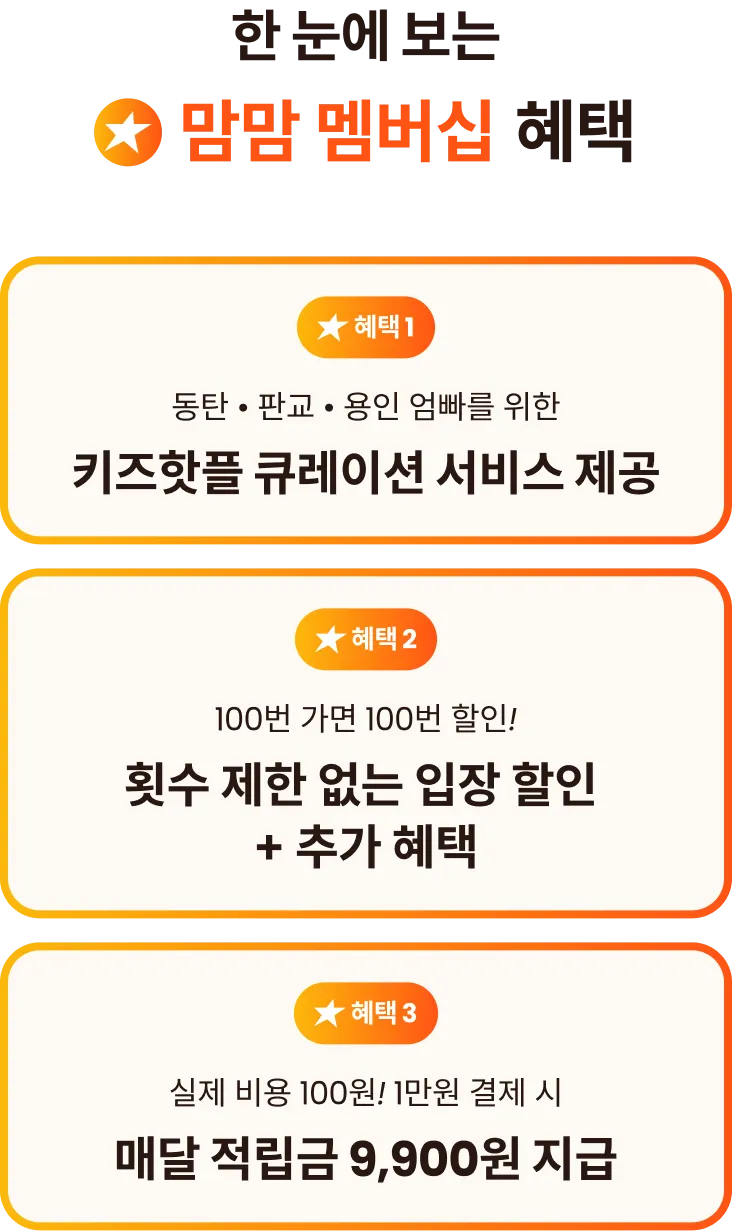 인근 지역에서 아이 키우시는 분이라면 — 특히, 한달에 한번이라도 키즈카페, 키즈 클래스, 각종 동물/농장 체험, 키즈풀과 테마파크 등을 이용하시는 분들이라면 무조건 이득!