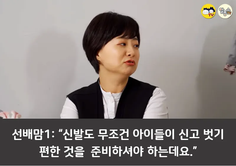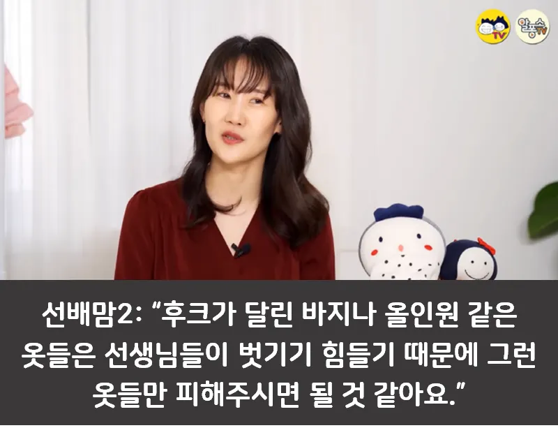 예를 들어, 후크가 달린 바지나 올인원 같은 옷들은 선생님들이 하나하나 벗기기 어려우니 피하는 것이 좋습니다.