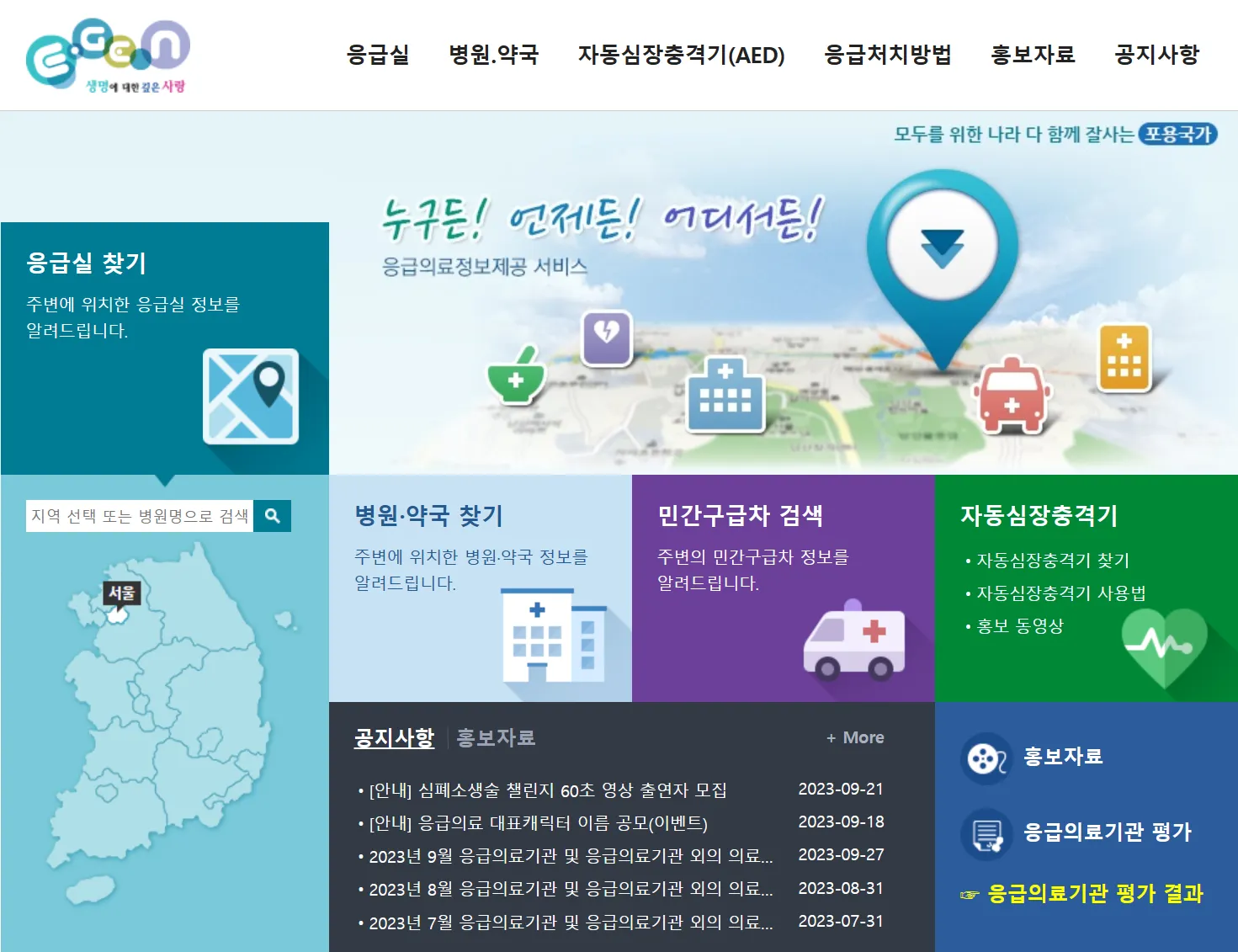 정보와 전국 응급실 운영기관의 정보를 확인할 수 있는 포털사이트에요