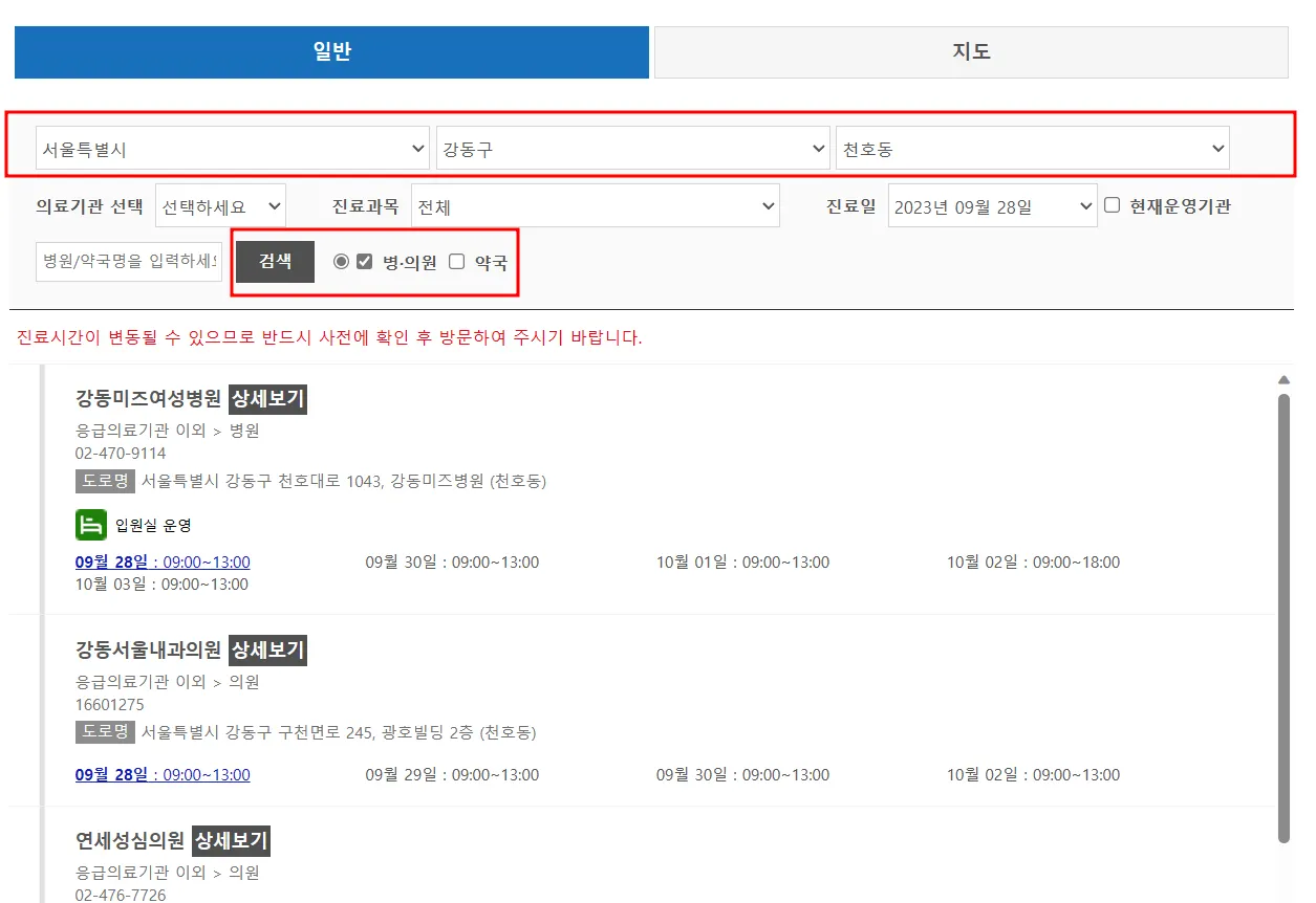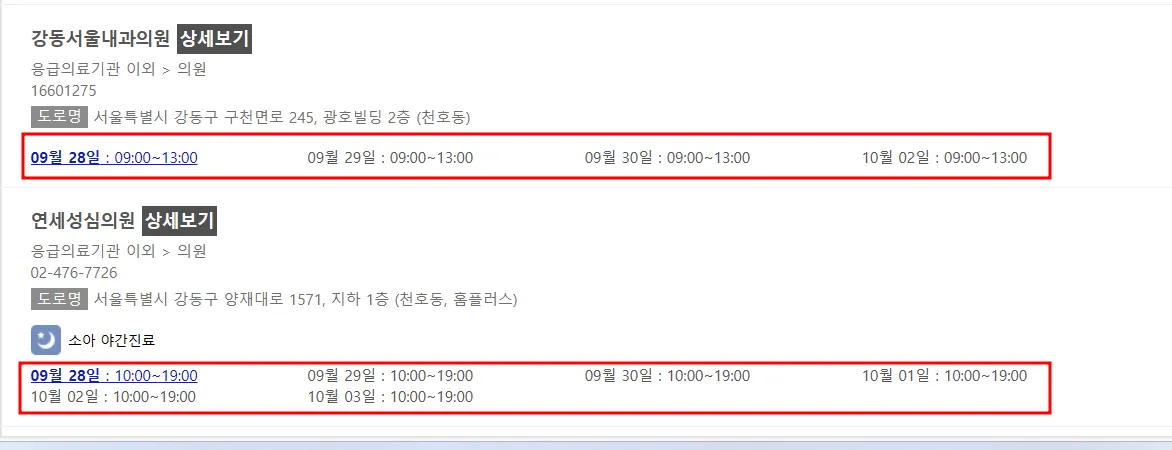 또한 기관 옆 ‘상세보기’를 누르면 기관 주소와 대표번호, 진료과목, 운영시간을 더 정확히 확인할 수 있어요