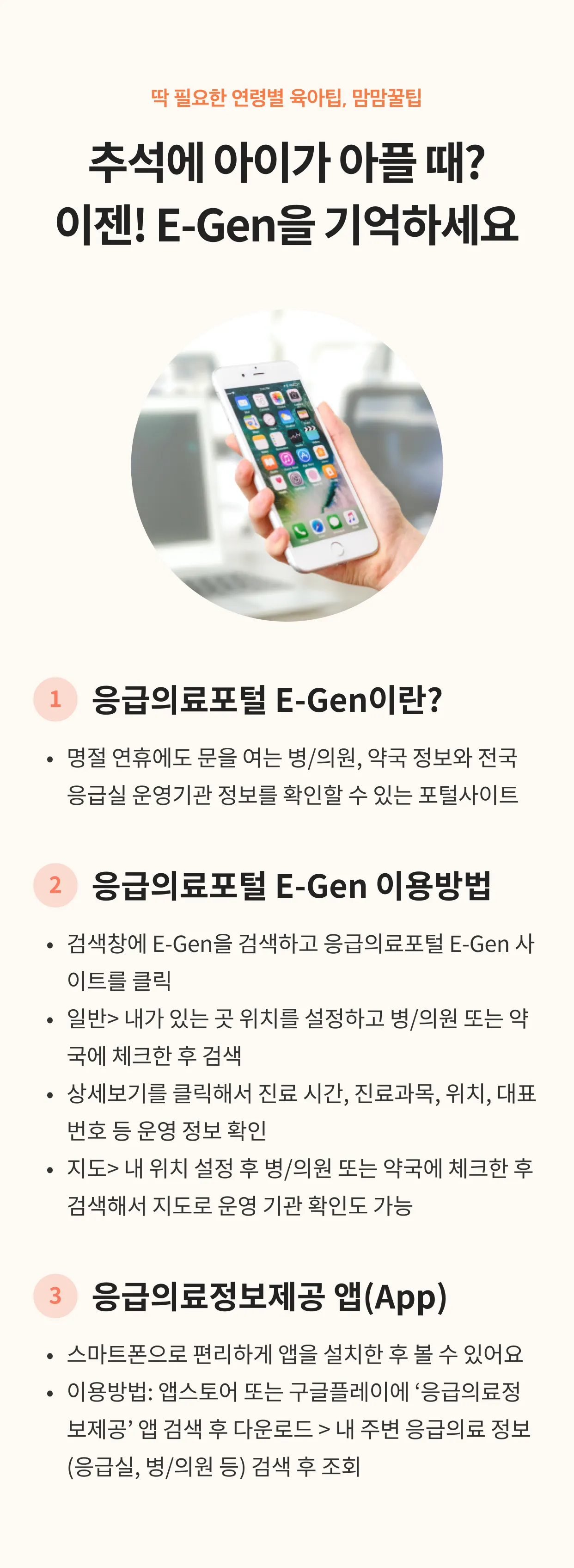 의 경우 6일이라는 긴 연휴가 껴 있어 아이가 아프기라도 하면 병원을 늦게 갈 수밖에 없을텐데요~ 응급의료포털 E-Gen을 이용하면 내 근처 가장 가까운 병원
