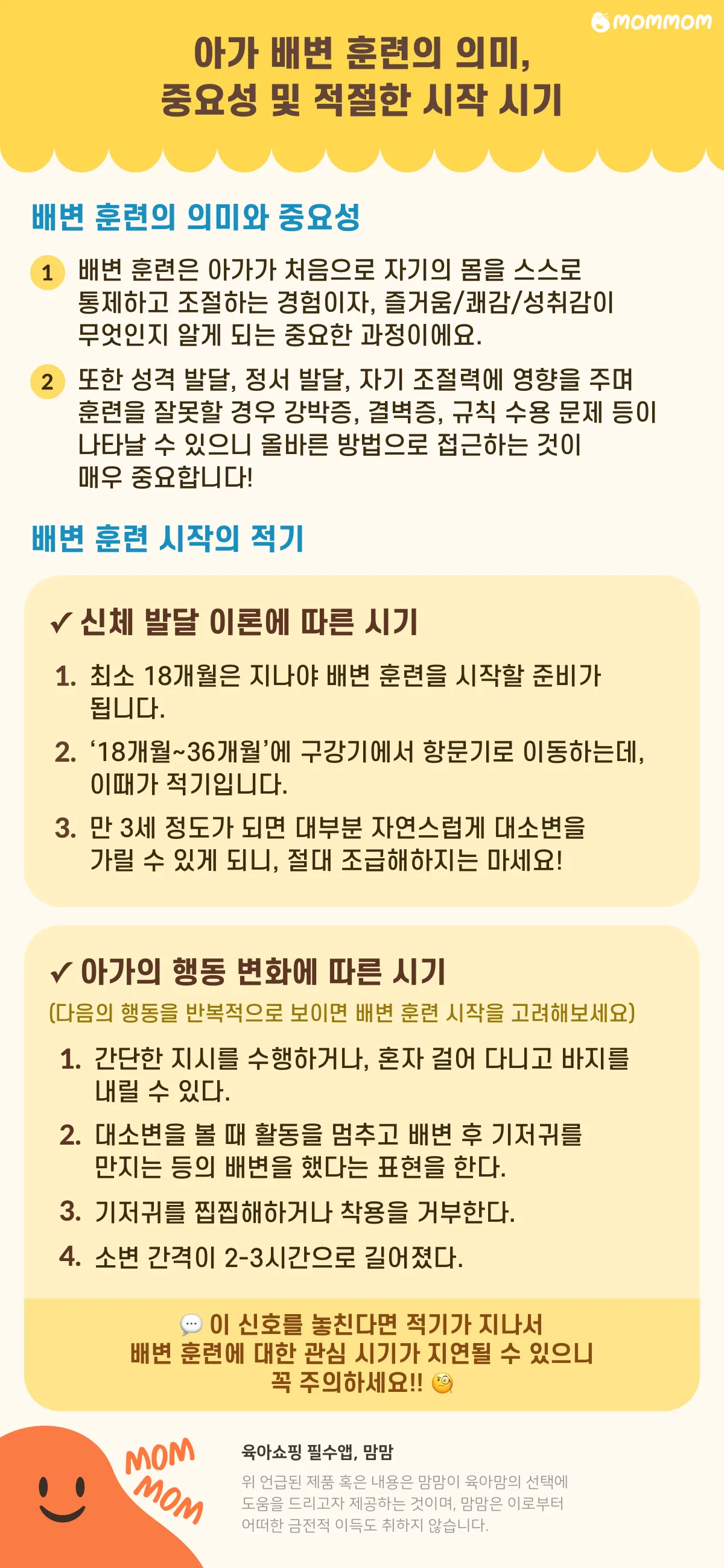 한 가지 절대 헷갈리시면 안되는 것이, 18개월부터 배변 훈련을 시작하라는 말이 아니라, 최소 18개월은 지나야 배변 훈련을 시작할 준비가 되었다는 뜻입니다.