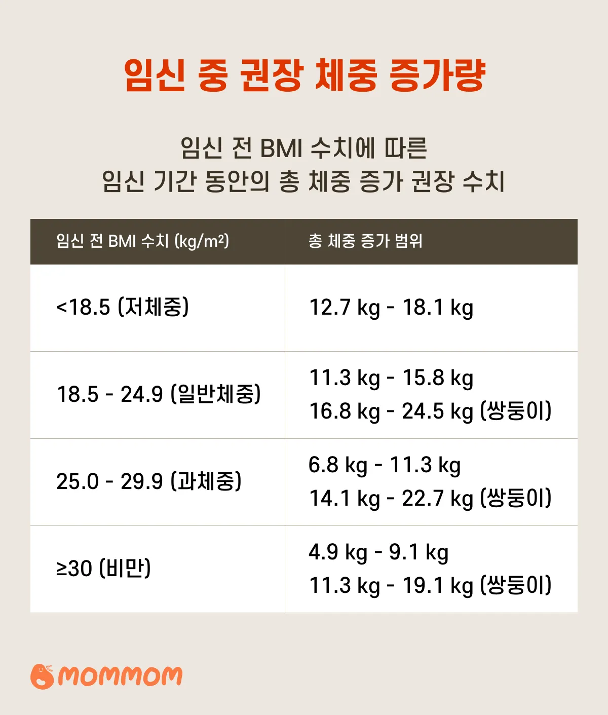 일반적으로 임신한 여성은 임신 첫 3개월 동안은 0.5kg~1.8kg, 그리고 나머지 임신 기간 동안 일주일에 0.5kg의 체중 증가가 권장되나, 이 또한 개인 별 BMI 수치에 따라 구체적인 체중 증가량이 다르니, 아래 표를 참고하셔서 관리해주시면 좋아요!