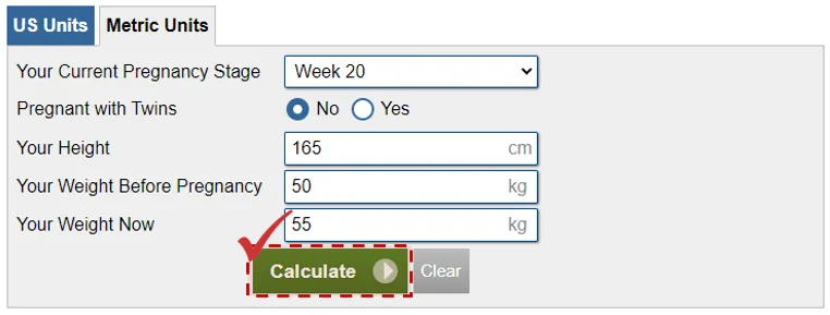 만약 개인의 몸무게/키/쌍둥이 여부를 고려한 임신 개월수별 권장 몸무게를 직접 계산해보시고 싶으시면 아래와 같이 해보세요!
